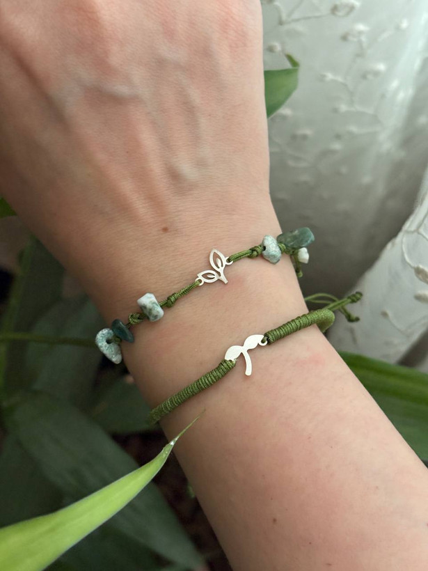 هر دو دستبند نقره هستن، دستبند جوانه با برگ بندش با سنگ عقیق خزه ای درست شده است