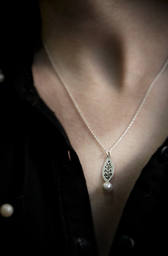 گردنبند نقره است و سیاه کاری شده است ، مروارید شِل است.