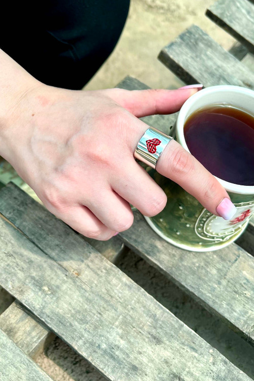 انگشتر نقره است و با قلب با نخ دوخته شده است.