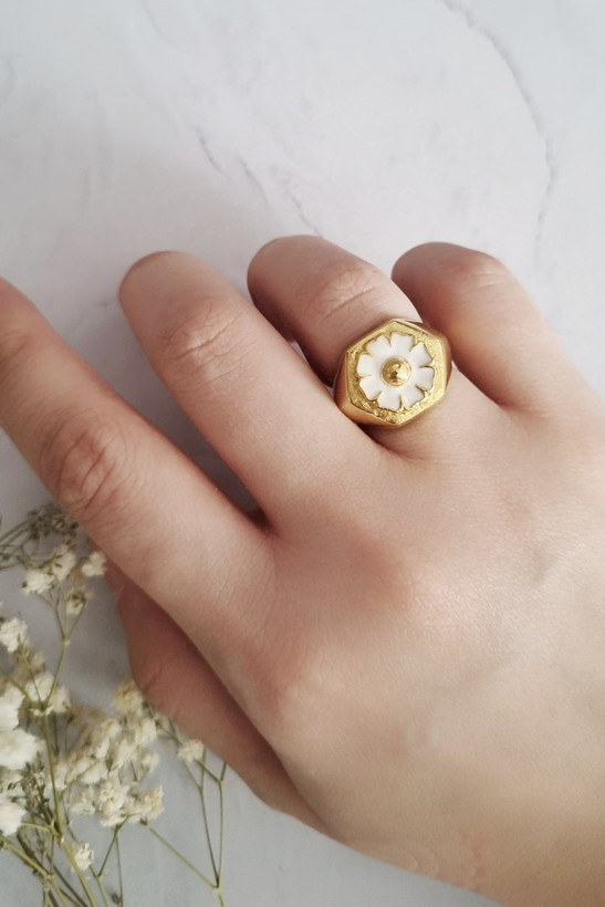 انگشتر نقره است و آبکاری طلا شده است، گل بابونه میناکاری شده.